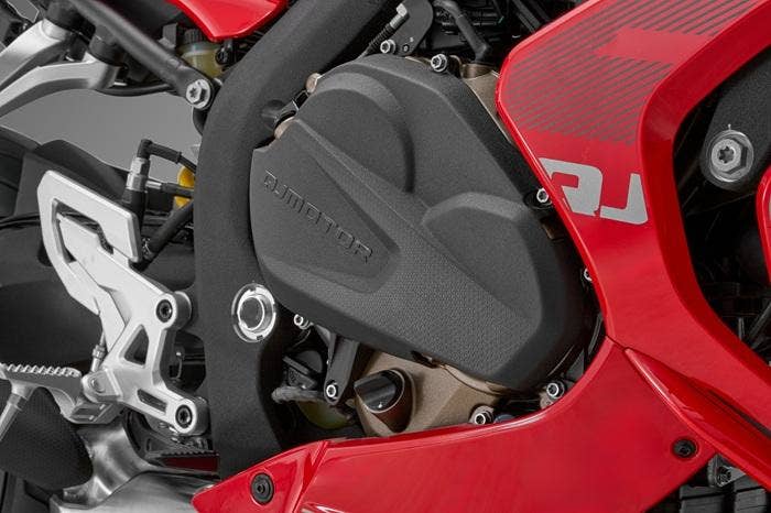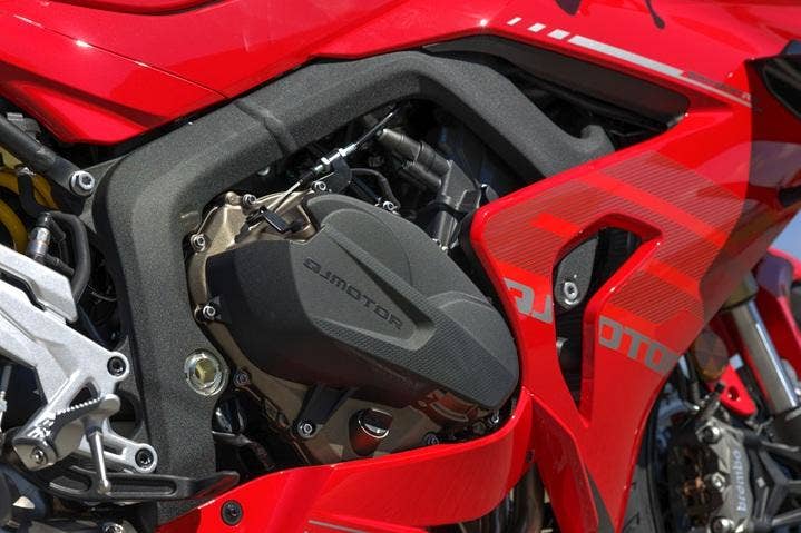 Každý silniční motocykl, který má ambice jezdit závody definuje především jeho motor. SRK 800 RR má řadový čtyřválec s rozvody DOHC se 16 ventily o objemu 778 ccm, generující výkon 95 koní a maximální točivý moment 75 Nm. S využitím náporového sání má motor špičkovou hodnotu výkonu dokonce 102 koní. Pro model 2026 je motor zásadně upraven. Nyní má mnohem silnější střední pásmo, na přidání plynu reaguje motor velmi silně a bez jakéhokoliv cukání. Výkon lineárně roste téměř až k omezovači. Nová řídící jednotka od Magneti Marelli zajištuje dokonalé dávkování paliva. Je třeba zmínit, že tento motor má velký potenciál co se týká ladění, protože v závodech světových supersportů má tato pohonná jednotka samozřejmě ještě vyšší hodnoty výkonu a kroutícího momentu. I sériový motor Vám však nabídne úžasné zrychlení, které tento špičkový motocykl z naší produkce nabízí.