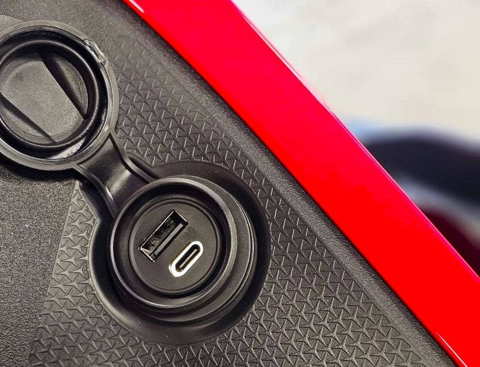 Na pravé straně, hned vedle kokpitu je pohodlně integrována zásuvka USB-A a USB-C! Můžete skrz ně nabíjet například mobilní telefon, nebo zapojit navigaci. USB zásuvky mají samozřejmě voděodolnolu gumovou krytku.